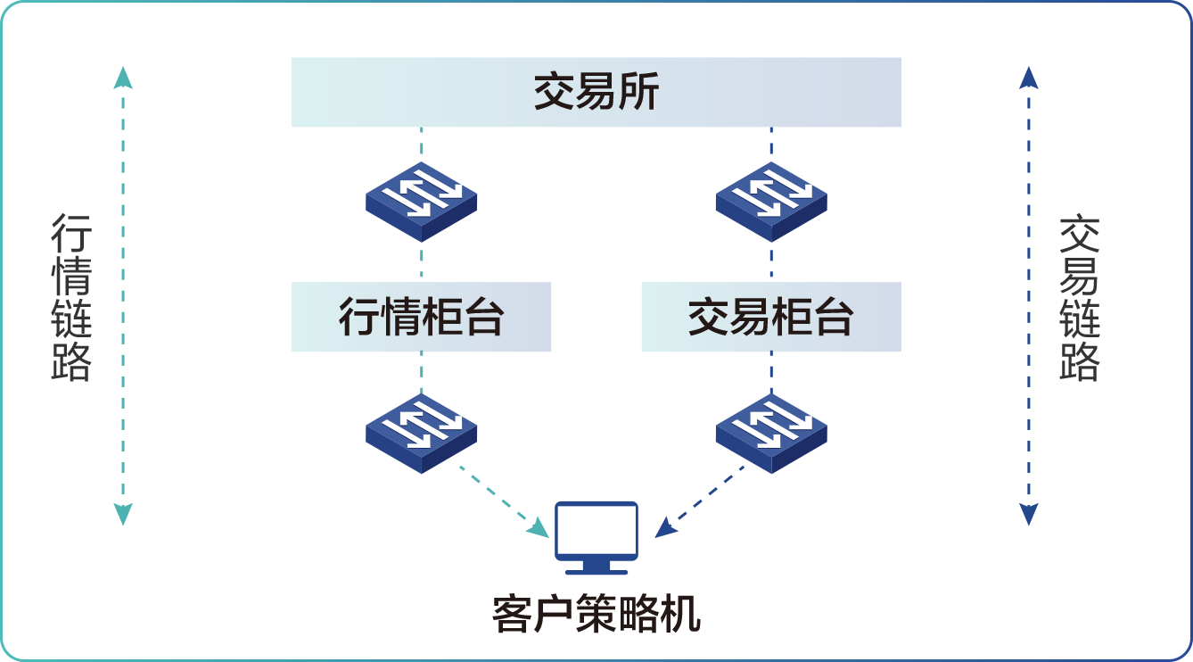 那到底有哪些因素影响交易系统的端到端时延?交易系统通常由行情柜台、交易柜台、策略服务器、交换机等设备组成,交易软件、服务器、网卡、交换机等软硬件设备的性能都会直接影响交易系统的整体延迟。其中,交换机作为整个系统连接的桥梁,是影响系统延迟的关键因素,已成为证券和期货公司“军备竞赛”的关键设施。
