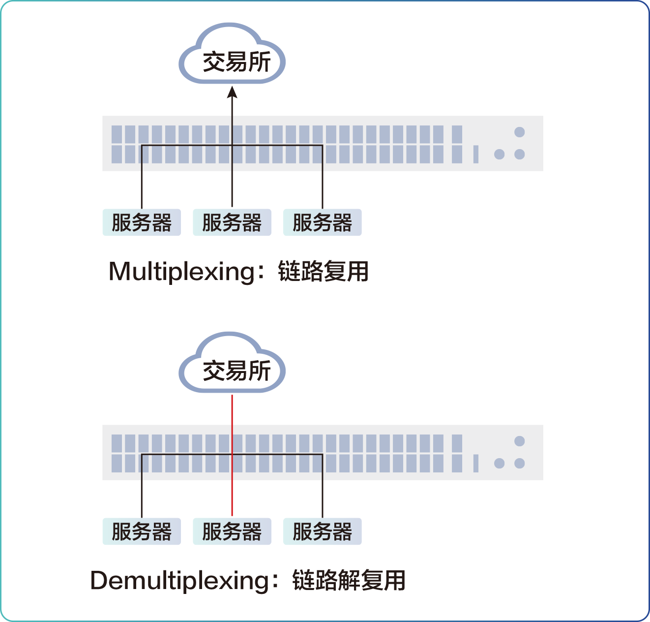L1.5超低时延交换机通过交叉矩阵结构、CDR电路、FPGA应用等技术,还能构建出效果大于L1的能力,更好匹配高频交易需求。在极速交易系统组网中,交换机通常连接多台策略服务器,并将来自多台策略服务器的数据流汇聚传输至交易所,在这个过程中由于需对同时到达的数据包进行缓存处理,从而导致传输延迟较高。而L1.5超低时延交换机采用基于FPGA的多路复用技术可大幅降低该延迟,利于将订单快速发送至交易所。