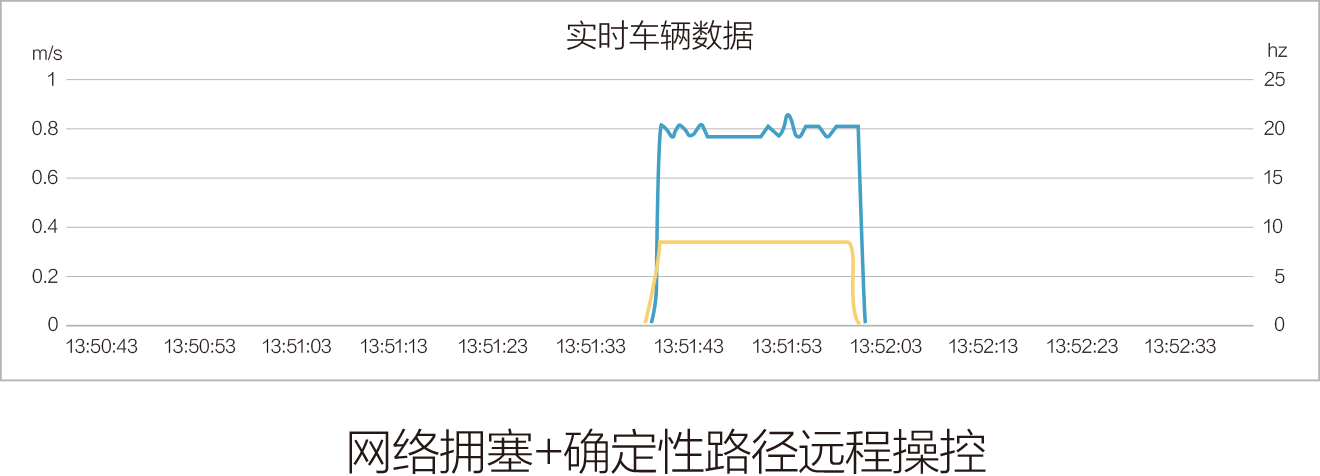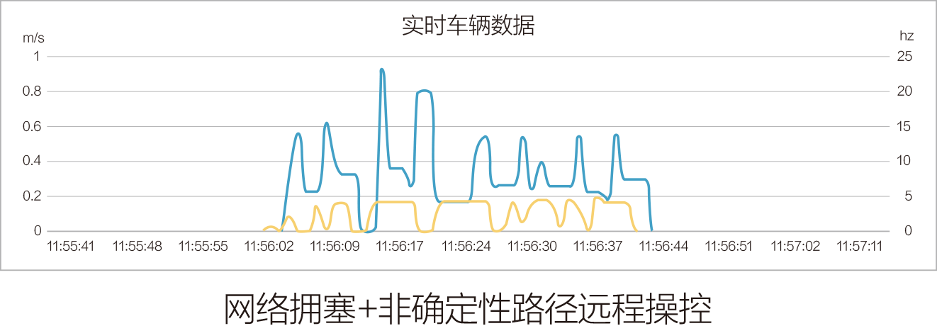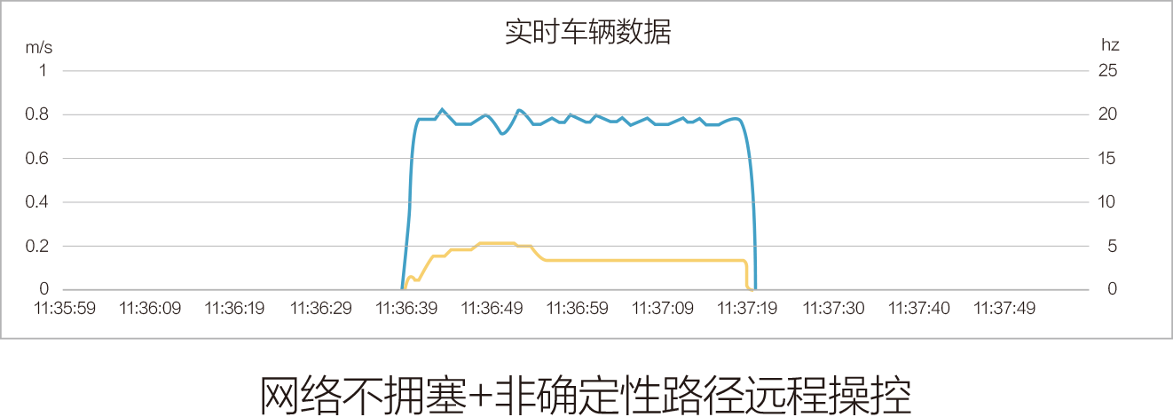 说明:蓝色曲线表示AGV小车接收到控制指令的发包频率(hz),黄色曲线表示小车的实时运行速度(m/s);下同。