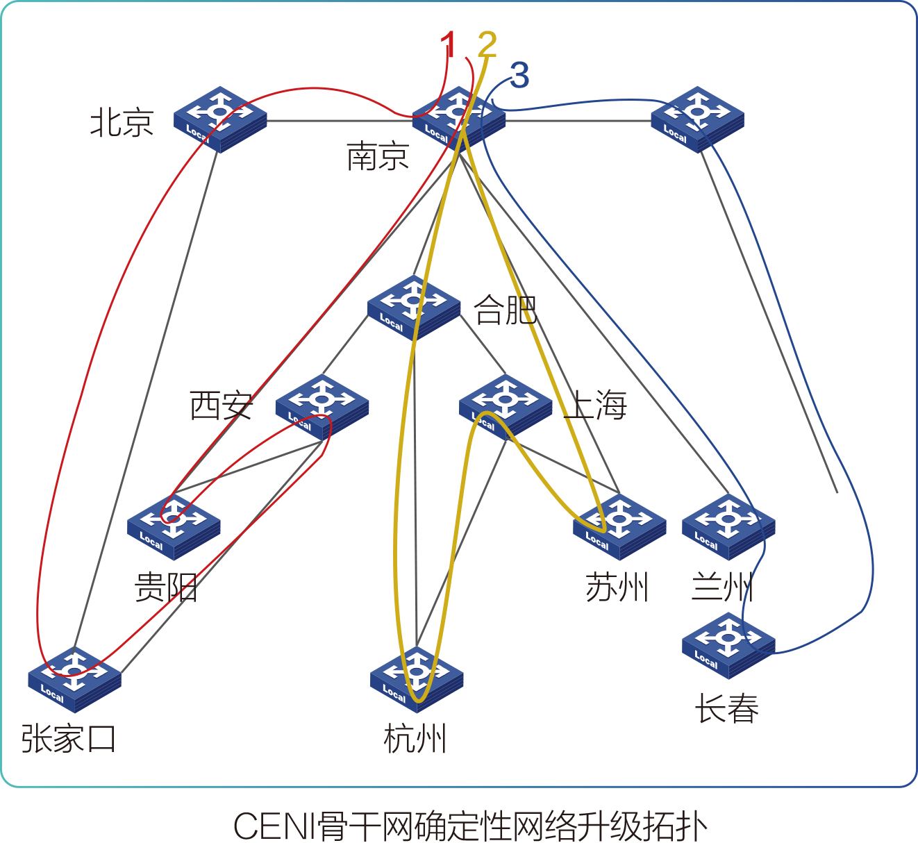 新华三集团CR16000-F和CR16000-M系列高端路由器在山东未来网络完成全球首张确定性网络的建设,树立了新华三在确定性网络新领域的技术实力。因此,新华三又进一步加强与江苏未来网络创新研究院等深入合作,在CENI全国骨干网中完成了确定性网络的改造升级。