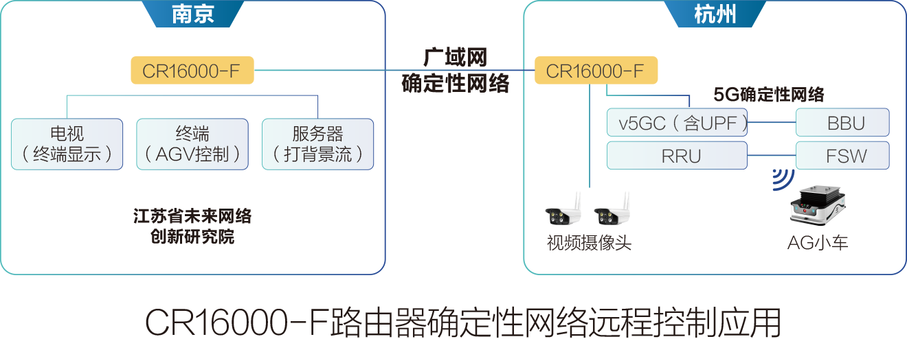 此次应用的远程控制中心部署在南京江苏未来网络创新研究院,被控制的智能小车设在杭州新华三未来工厂,广域网确定性通过CENI骨干网部署在南京和杭州的新华三高端路由器CR16000-F承载。