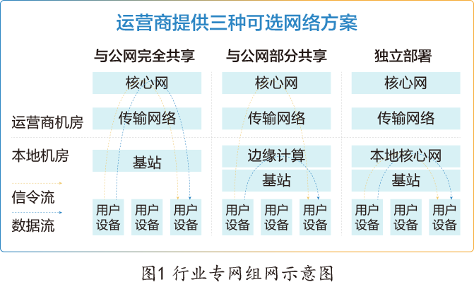 一般来说,行业用户的5G专网建设由运营商来承建,运营商往往会根据不同应用场景和用户需求的不同采用不同的专网建设模式,行业专网包括三种组网方式,分别是与公网完全共享方式、与公网部分共享方式和独立部署方式。