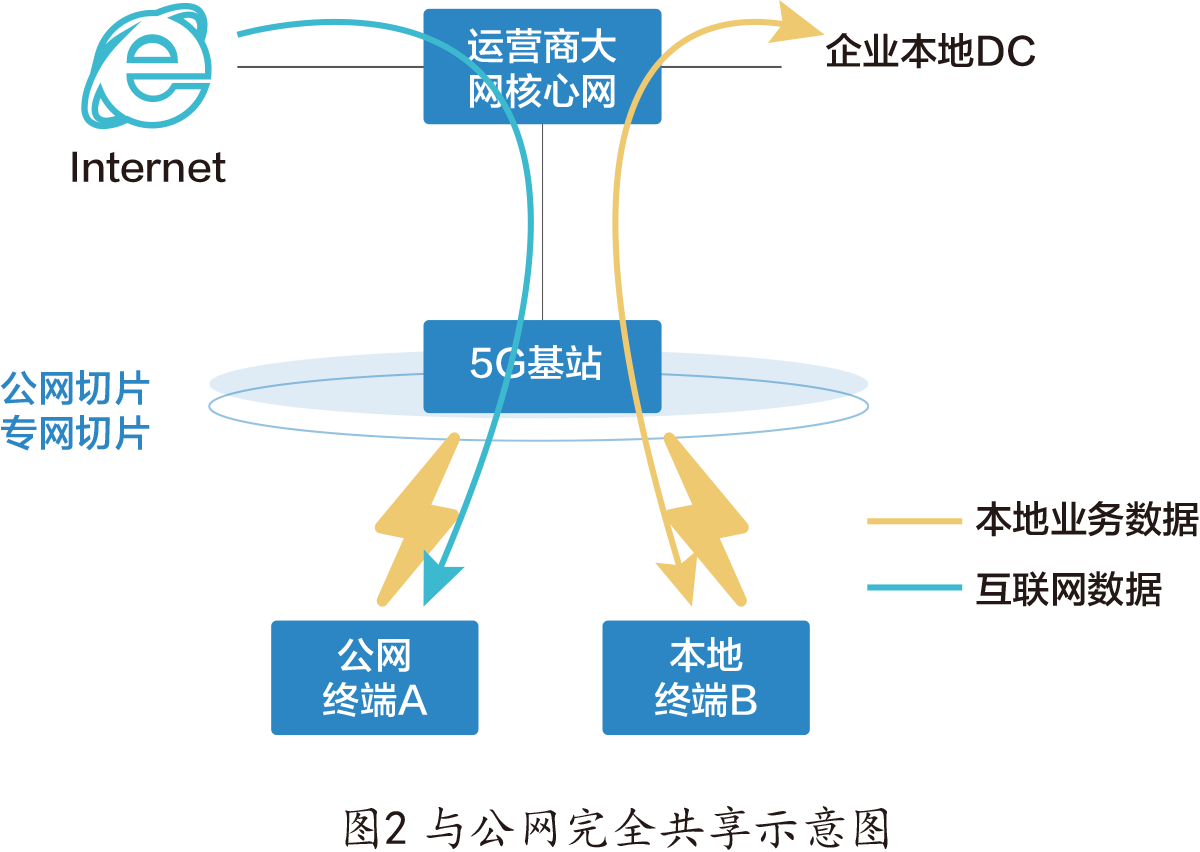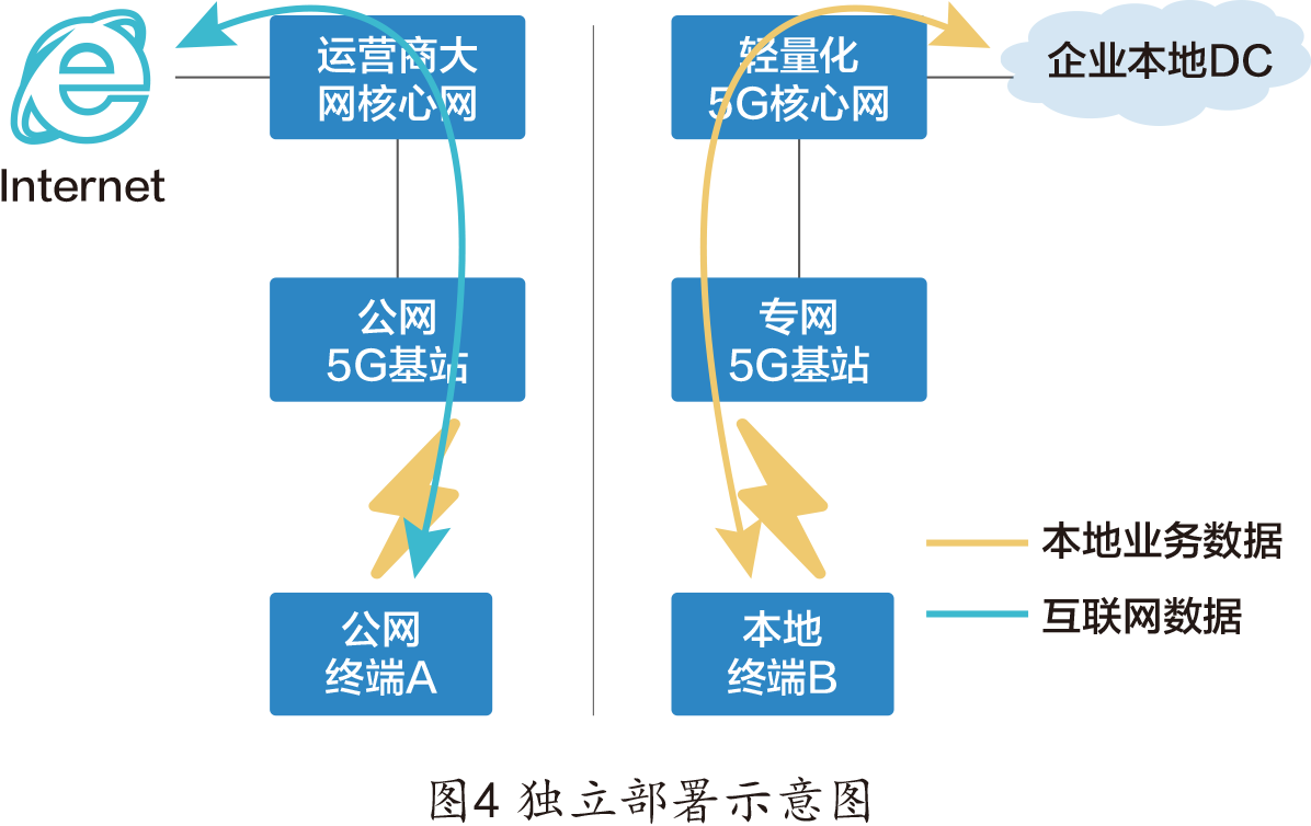 该方案中运营商为垂直行业用户建设独立的本地轻量化核心网,无线侧独立部署5G基站,针对行业终端的信令流和数据流都在本地处理,与运营商大网物理隔离。